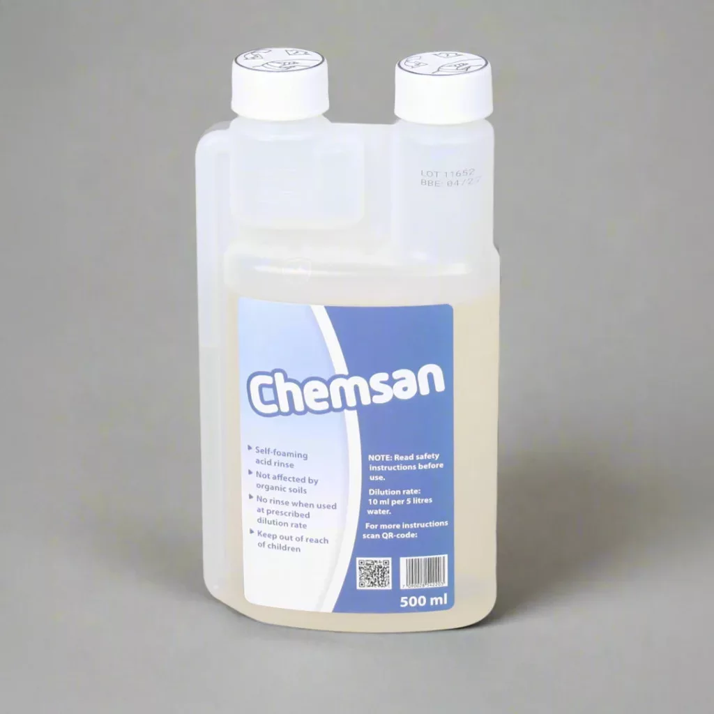 Wymieszać 10 ml Chemsanu z 5 litrami wody, aby uzyskać roztwór o stężeniu 0,2%. Wyższe stężenia wymagają dokładnego spłukania. Przed użyciem Chemsanu wszystkie powierzchnie należy dokładnie wyczyścić i spłukać. Czas działania preparatu Chemsan powinien wynosić co najmniej 2 minuty. Aby zapewnić skuteczne czyszczenie, wartość pH środka chemicznego powinna wynosić 3,5 lub mniej. Po rozcieńczeniu twardą wodą preparat Chemsan może stać się mętny, ale pozostaje skuteczny, dopóki pH wynosi 3,5 lub mniej.