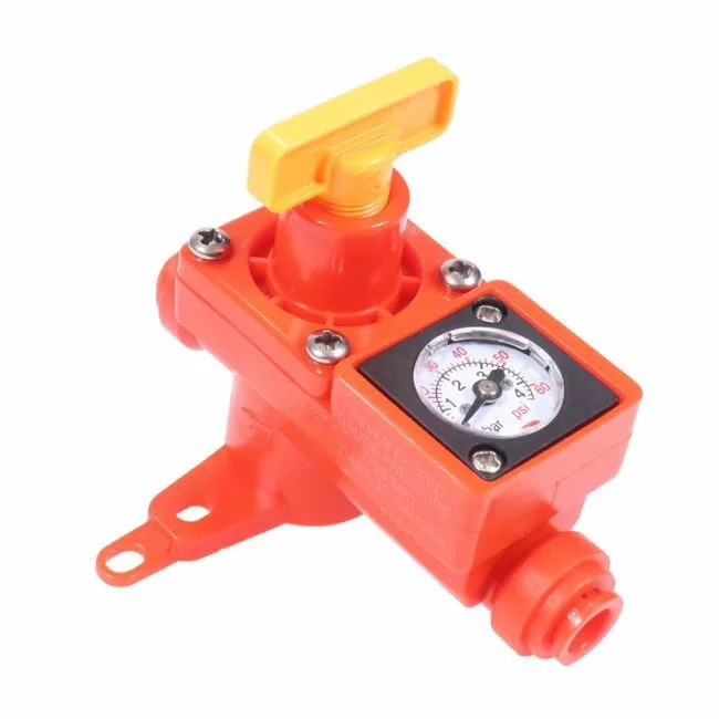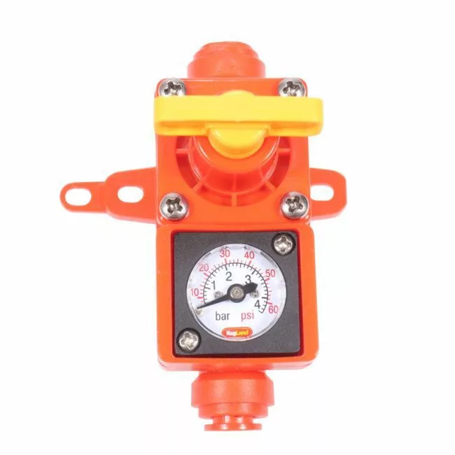 Wbudowany manometr działa w zakresie 0–1 bar/0–15 psi, a ciśnienie można zwiększyć, obracając środkową żółtą gałkę w prawo, a zmniejszyć – w lewo.