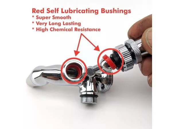 NUKATAP rozwiązuje ten problem i jest najbardziej odpornym chemicznie kranem, jaki kiedykolwiek wyprodukowaliśmy. W przeciwieństwie do niektórych starszych modeli kranów, które mają elementy ocierające się „metal o metal”, które z czasem ulegają zużyciu i dają „szorstkie wrażenie”, NUKATAP został zaprojektowany z płynnym przesuwem, co gwarantuje długą żywotność elementów kranu. Przesuwka z matrycą z gumy TPV jest również jednym z najtrwalszych mechanizmów uszczelniających, który wytrzymuje duże siły dźwigniowe wywierane przez długie uchwyty kranów, które w tradycyjnych konstrukcjach kranów powodowałyby zużycie uszczelek.