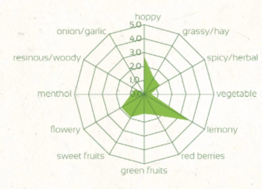 Krewniak odmian Cascade, Hallertau Blanc i Huel Melon. Wyhodowany w Niemczech w 2012 roku. Warto również sprawdzić: Tutaj można przeczytać pełny opis (angielski)