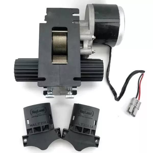 Wyposażony jest w wbudowany silnik 24 V, który jest wystarczająco mocny, aby z łatwością rozgniatać podskakujące ziarna słodu. Niektórzy producenci młynów wykonują młyny zbożowe ze stali. W niektórych innych młynach wysokiej jakości stal jest hartowana, dzięki czemu ząbki pozostają dłużej ostre i dłużej przyciągają ziarna. Niektórzy inni producenci próbują rozwiązać ten problem, stosując walce zębate, dzięki czemu walce nieco lepiej chwytają ziarno, lub stosują 3 walce, gdzie pierwsze dwa walce o większych szczelinach wtłaczają ziarno do trzeciego walca. Naszym zdaniem te opcje nie rozwiązują prawdziwego problemu, jakim jest stępienie się tych stalowych walców, zwłaszcza gdy rozdrabniamy twarde ziarna. Młyn diamentowy MaltZilla ma zupełnie inną konstrukcję i jest pierwszym na świecie, który wykorzystuje diamenty osadzone w powierzchni walca. Diamenty te pozostają tak samo ostre jak pierwszego dnia, nawet po przetworzeniu wielu ton ziarna w młynie.