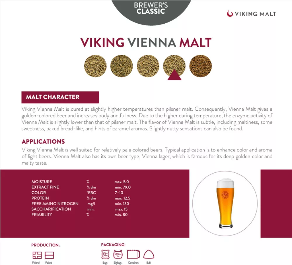 A słód wiedeński Viking to wysokiej jakości słód bazowy, suszony w nieco wyższej temperaturze niż słód pilzneński. Dzięki temu nadaje piwu głębszy złoty kolor, pełniejszy smak i bogatszy bukiet aromatów. Chociaż jego aktywność enzymatyczna jest nieco niższa w porównaniu ze słodem pilzneńskim, to jednak jest to doskonały wybór, jeśli celem jest wzbogacenie koloru i smaku piwa.