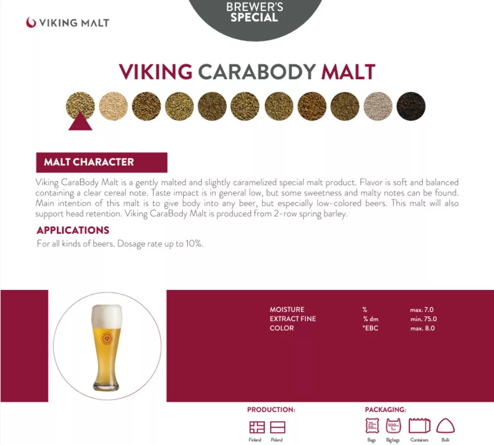 A Słód Viking Carabody to lekko karmelizowany, delikatnie słodowany specjalny słód, wytwarzany z dwurzędowego jęczmienia piwnego. Jego smak jest łagodny i zrównoważony, z wyraźnymi nutami zbożowymi, a jego wpływ jest dyskretny, ale wzbogaca gotowe piwo delikatnymi nutami słodkimi i słodowymi.
