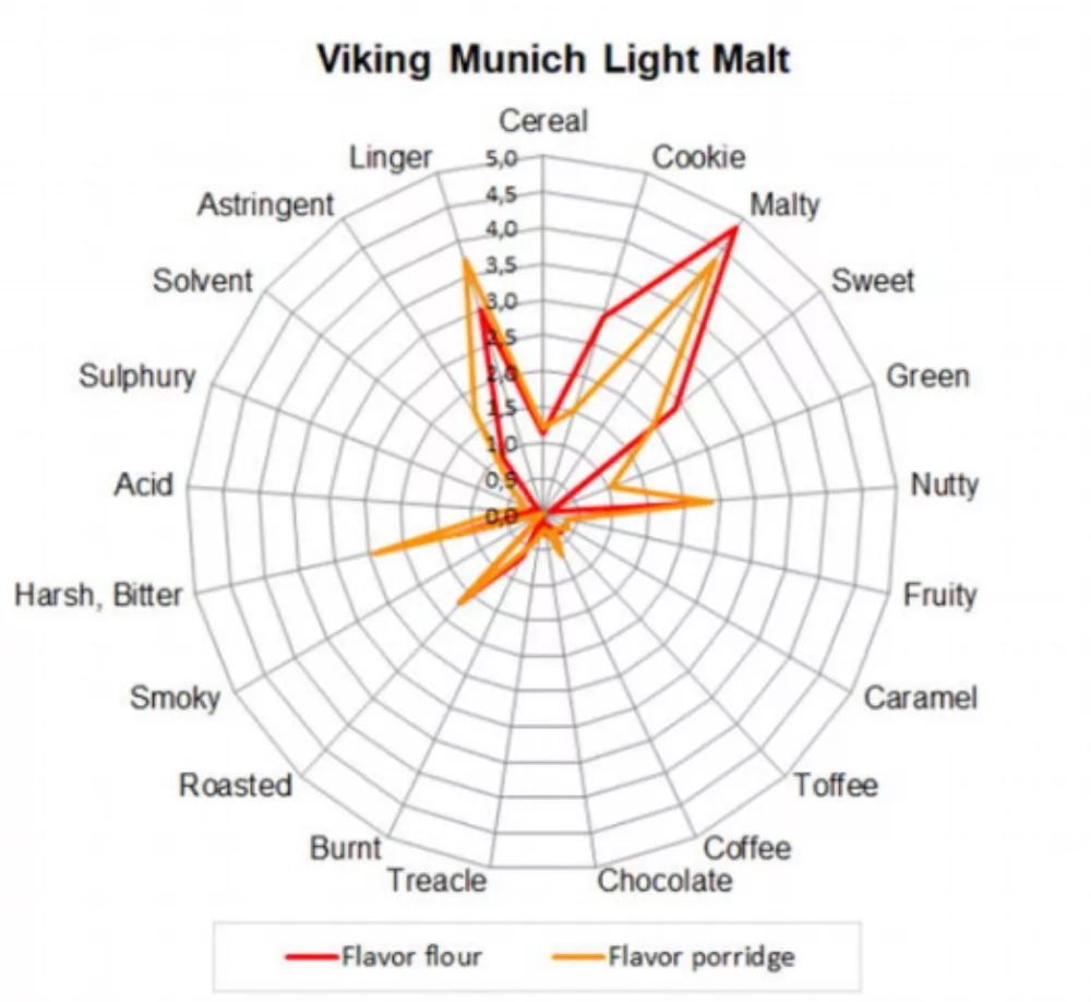 Słód Viking Munich charakteryzuje się aromatycznym, słodowym charakterem. Jego charakter uzyskuje się dzięki suszeniu w wyższej temperaturze 110–120°C. Zwiększa trwałość piany i pełnię smaku.