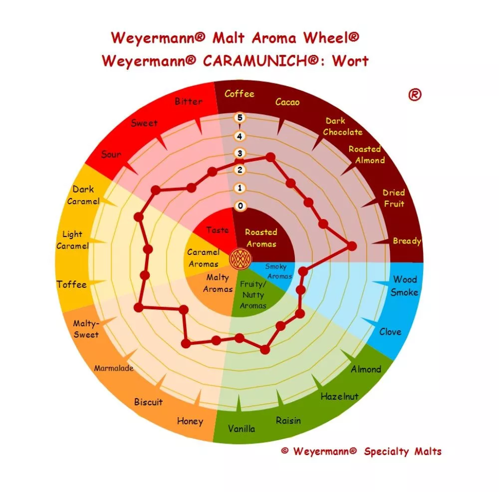 Weyermann® Caramunich® III. jest produkowany z najwyższej jakości słodu. Dzięki specjalnemu procesowi karmelizacji ziarno ulega całkowitej karmelizacji. Nadaje piwu bursztynowo-miedzianoczerwony kolor oraz mocny słodowy smak. W zapachu przypomina wypieki.