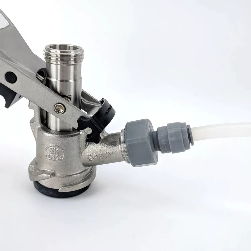 Po nałożeniu na standardowy gwint rury 5/8" otrzymujemy na drugim końcu szybkozłącze 9,5 mm (3/8") do łatwego podłączenia rury gazowej. Materiał: tworzywo sztuczne Producent: KegLand
