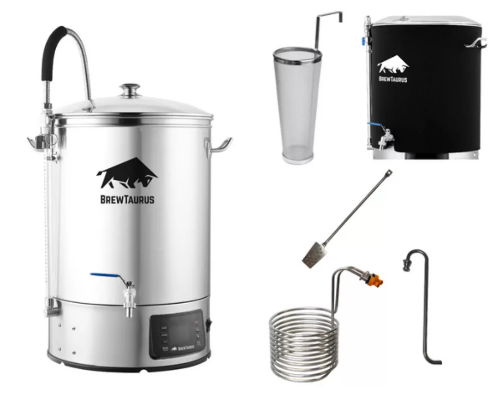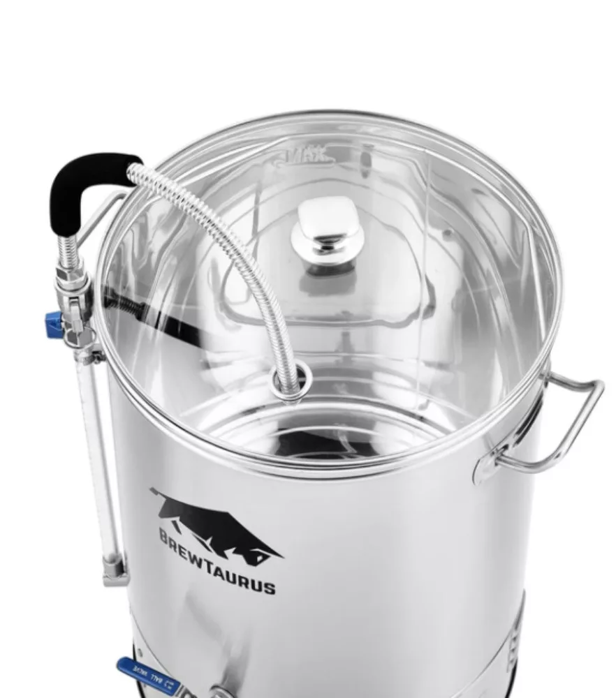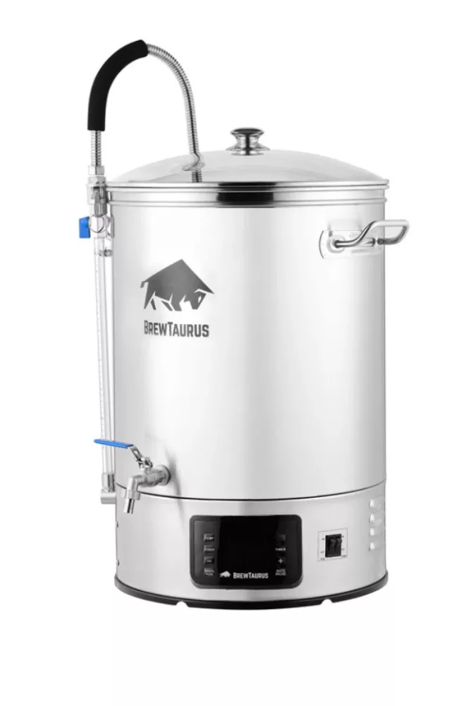 Urządzenia do warzenia piwa BrewTaurus pod względem jakości dorównują większości dostępnych na rynku urządzeń do warzenia piwa. Jednak ich wyposażenie jest niezwykle korzystne w stosunku do ceny. Producent jest dumny z jakości swoich produktów, dlatego udziela na nie 2-letniej gwarancji. Dostępne są dwa rozmiary: mniejszy 45-litrowy i większy 65-litrowy. Te dwa rozmiary zostały tak dobrane, aby nie trzeba było iść na kompromis nawet w przypadku piw o wyższej zawartości alkoholu. Model BrewTaurus o pojemności 65 litrów jest odpowiedni dla tych, którzy chcą warzyć jednocześnie dwie porcje w kadziach fermentacyjnych. Na pierwszy rzut oka rozmiar może wydawać się nieco przesadzony, jednak słód pęcznieje podczas zacierania, więc w przypadku mniejszych urządzeń należy uważać, aby podczas mieszania nie wypadł z kosza zaciernego. Najważniejsze cechy: Nadaje się do zacierania 20 kg słodu Prosta obsługa (9 programów) Przyjazny dla użytkownika (przyciski dotykowe i duży wyświetlacz) Wydajny (dwukierunkowy element grzejny o mocy 3000 W) Wygodny (wyjmowany kosz do zacierania, elastyczny wąż do spuszczania brzeczki, całkowicie nierdzewna konstrukcja) Dodatki (hop spider, 13-metrowa nierdzewna spirala chłodząca, ramię wirówkowe, nierdzewna łopatka mieszająca, płaszcz izolacyjny) Aby zapewnić optymalne oddawanie ciepła, urządzenie do warzenia piwa wyposażono w dwa elementy grzejne (3000 W). Konstrukcja z podwójnym dnem sprawia, że brzeczka trudniej przywiera do dna kotła. Filtr typu bazooka zapewnia czyste odcedzanie. Pompa magnetyczna odpowiada za pompowanie brzeczki, ponieważ mieszanie odbywa się w polu magnetycznym (brak fizycznej osi). W przypadku zatkania pompa nie ulega spaleniu i po wyczyszczeniu można z niej dalej korzystać. Sama maszyna to imponująca konstrukcja o wadze 12 kg. Produkt zostanie wysłany w ciągu 4-5 dni roboczych. Ze względu na swoje wymiary produkt może być dostarczony wyłącznie przez firmę kurierską GLS.
