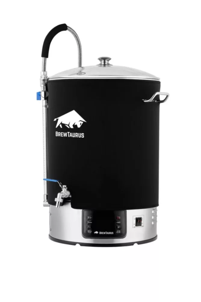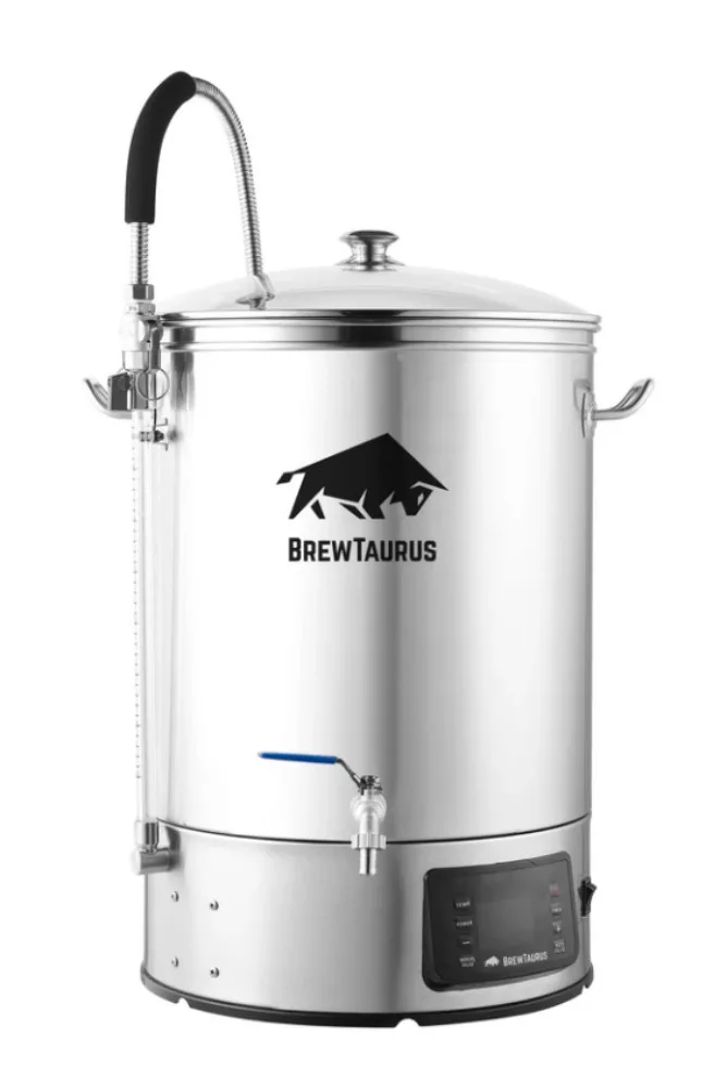 Urządzenia do warzenia piwa BrewTaurus pod względem jakości dorównują większości dostępnych na rynku urządzeń tego typu. Jednak ich wyposażenie jest niezwykle korzystne w stosunku do ceny. Producent jest dumny z jakości swoich produktów, dlatego udziela na nie 2-letniej gwarancji. Dostępne są dwa rozmiary: mniejszy 45-litrowy i większy 65-litrowy. Te dwa rozmiary zostały tak dobrane, aby nie trzeba było iść na kompromis nawet w przypadku piw o wyższej zawartości alkoholu. 45-litrowy BrewTaurus jest odpowiedni dla tych, którzy chcą uwarzyć jednorazowo porcję odpowiadającą zawartości jednego wiadra fermentacyjnego. Na pierwszy rzut oka rozmiar może wydawać się nieco przesadzony, jednak słód pęcznieje podczas zacierania, więc w przypadku mniejszych urządzeń należy uważać, aby podczas mieszania nie wypadł z kosza zaciernego. Najważniejsze cechy: Nadaje się do zacierania 15 kg słodu Prosta obsługa (9 programów) Przyjazny dla użytkownika (przyciski dotykowe i duży wyświetlacz) Wydajny (dwukierunkowy element grzejny o mocy 2500 W) Wygodny (wyjmowany kosz zacierowy, pompa z elastycznym wężem, całkowicie nierdzewna konstrukcja) Dodatki (hop spider, 13-metrowa nierdzewna spirala chłodząca, ramię wirówkowe, nierdzewna łopatka mieszająca, płaszcz izolacyjny) Aby zapewnić optymalne odprowadzanie ciepła, warzelnia została wyposażona w dwa elementy grzejne (2500 W). Konstrukcja z podwójnym dnem sprawia, że brzeczka trudniej przywiera do dna kadzi. Filtr typu bazooka zapewnia czyste odcedzanie. Pompa magnetyczna odpowiada za pompowanie brzeczki, ponieważ mieszanie odbywa się w polu magnetycznym (brak fizycznej osi). W przypadku zatkania pompa nie ulega spaleniu i po wyczyszczeniu można z niej dalej korzystać. Produkt zostanie wysłany w ciągu 4-5 dni roboczych. Ze względu na swoje wymiary produkt może być dostarczony wyłącznie za pośrednictwem firmy kurierskiej GLS.