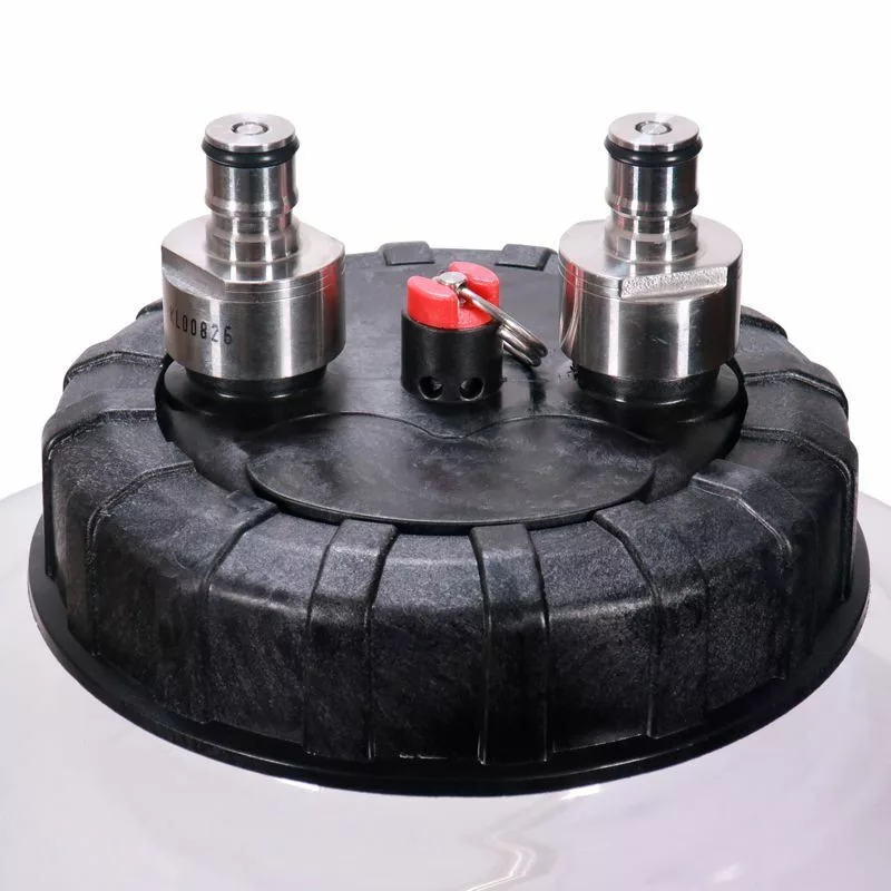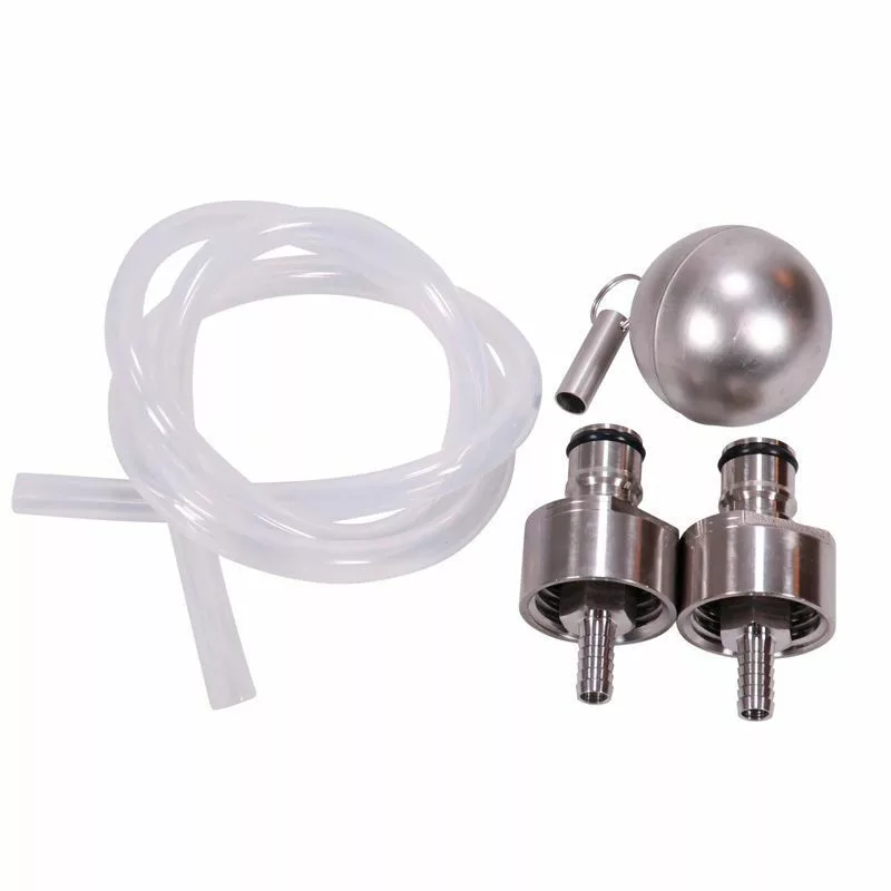 - 2 sztuki głowic ze stali nierdzewnej, do których można przymocować standardowe złącze ball lock do beczek; nakręca się je na dwa gwinty znajdujące się na pokrywie Fermzilla